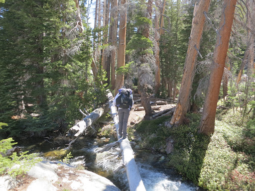 Before Laurie reached halfway, she stopped, looked back and said, “I can’t do it.” I went out on the log toward her, helped her turn around and get off of the log. This was the first time Laurie had been turned around by a log crossing. After reassuring her that this was indeed a harder-than-your-average log crossing, we found a safer area to cross and were back to gaining elevation in no time.