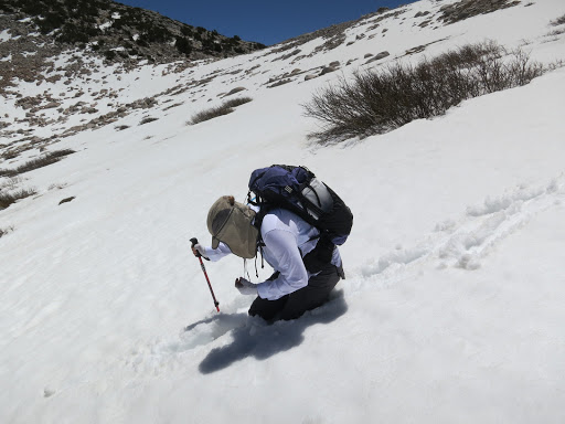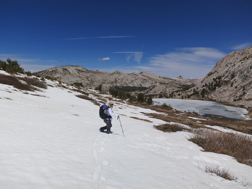 From Vogelsang Pass, we really got a sense of how much snow lingered from the recent storms. Looking down toward Vogelsang Lake, we knew it would be slow going. But we didn’t think it would be this slow.