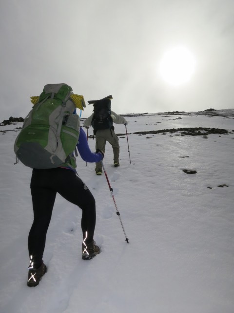 We dropped our packs and devoured most of the food in our sacks. After consuming too much guyere cheese, an entire tray of smoked salmon, gorp, powerberries, and ginger chews, we were ready to set off once again. Except we didn’t want to put on our wet socks and shoes.