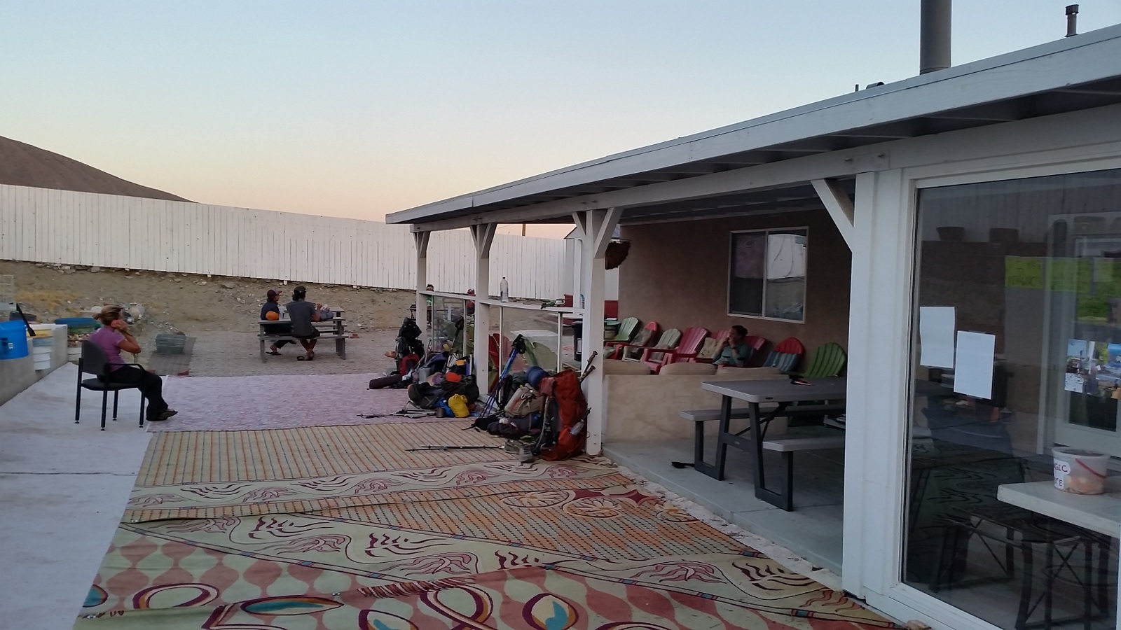 Laurie came back to life after drinking a cold Gatorade. We soaked our feet, washed out our socks and hung out in the anarondack chairs on the porch. The entire backyard is covered in carpet and it felt good to walk around with barefeet. We ate dinner and chatted with other hikers until it was bedtime.