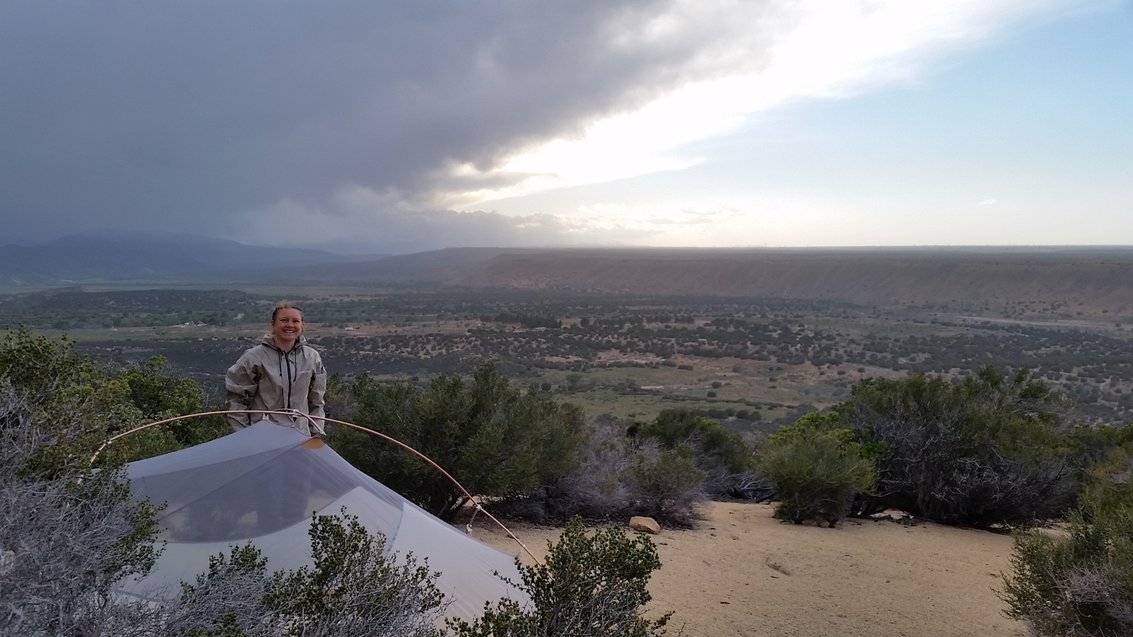 We settle on a flat-ish spot out of sight from the trail. We set up our wet tent and Laurie goes about trying to clean it. She has not yet embraced the “dirt bag” lifestyle.