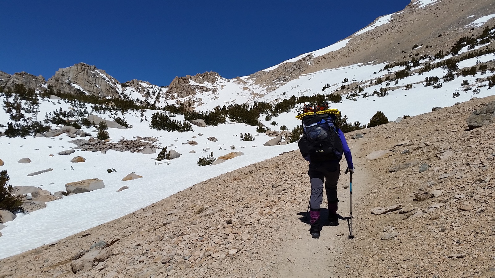 It was already warm. The trail switchbacked up, sometimes covered by snow. It was slow going. Our packs were heavy with 7 days worth of food. The snow was already softening in the sunlight so we had to be careful where we put our feet to prevent post holing.