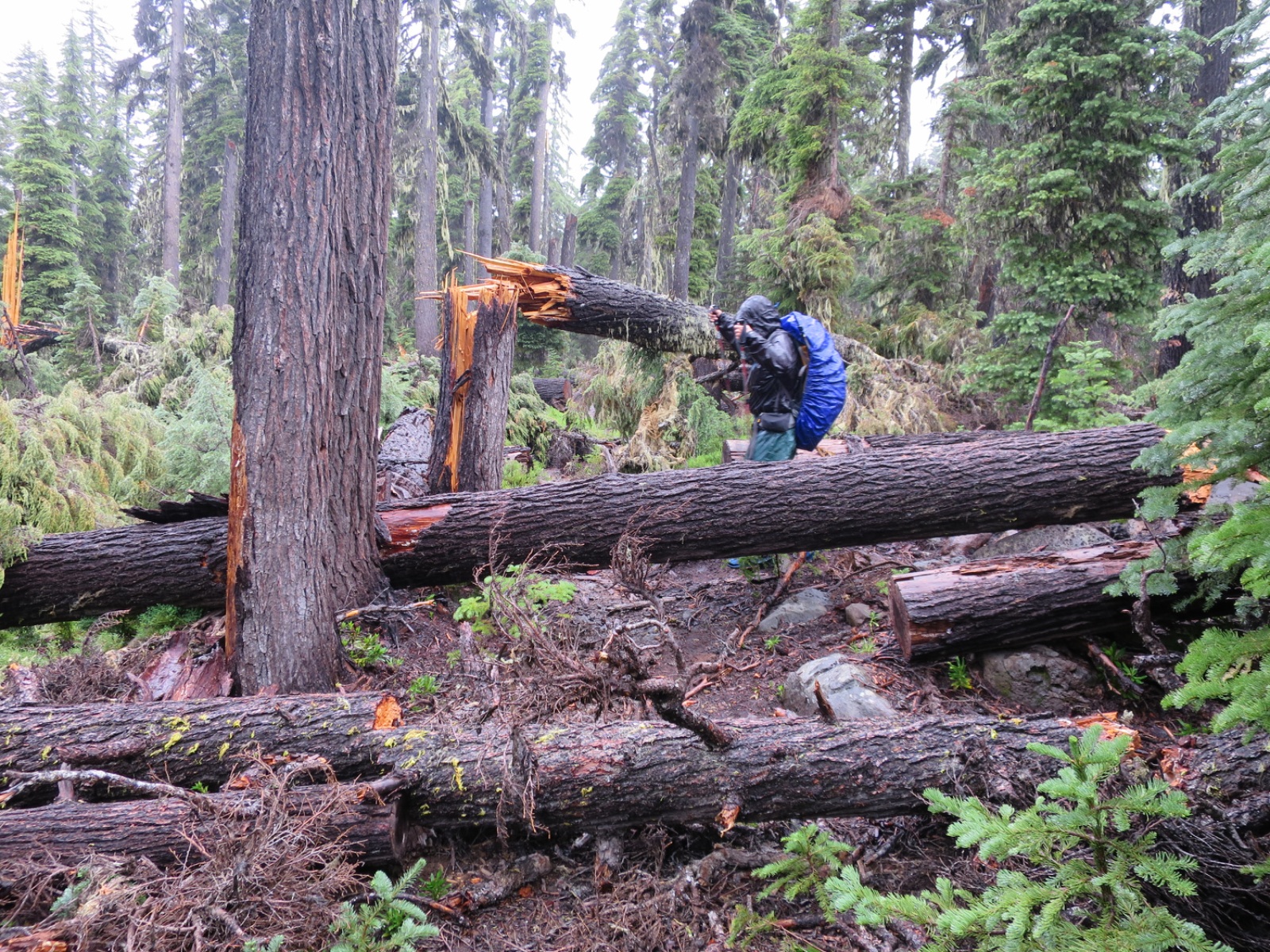 The sky was gray and gloomy when we started walking. From the get go we were climbing over logs. Our already wet feet were now cold from the wet plants.