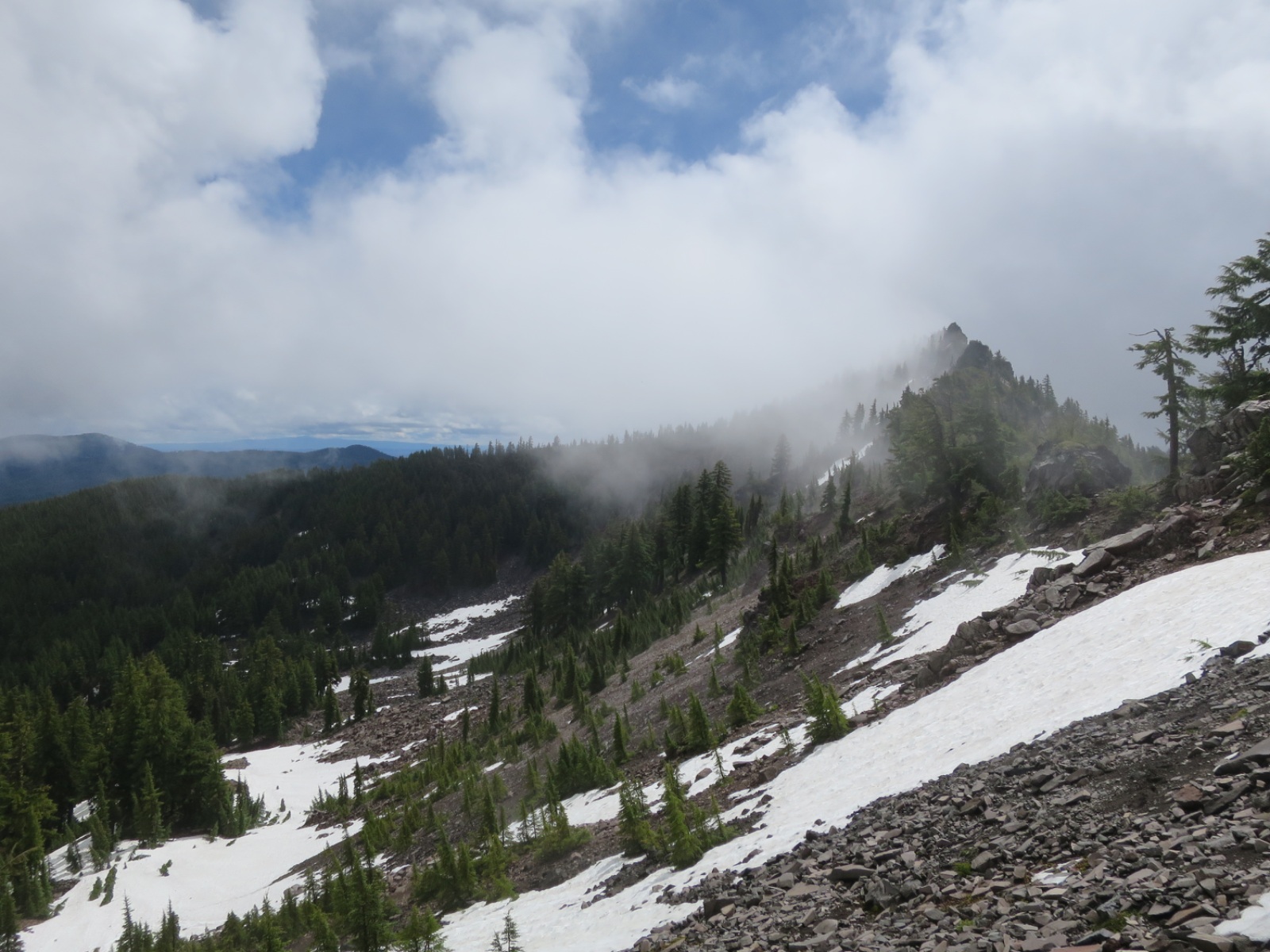 The sun popped in and out of the clouds as we descended. We encountered some snow but nothing compared to the Sierras. We took our time and got down with only 1 slip. It was actually fun to be back on the white stuff.