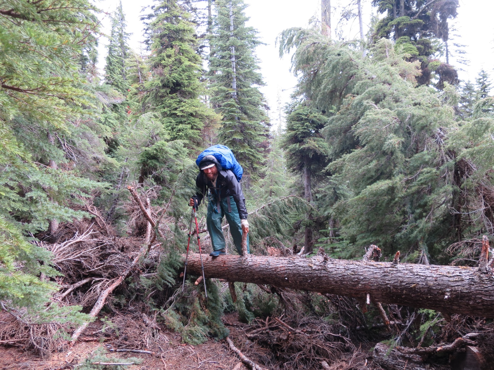By late afternoon Andy was so used to walking over logs that he nonchalantly led us over a pile of logs across the trail. Laurie was staring at the ground, listening to a podcast and blindly followed.