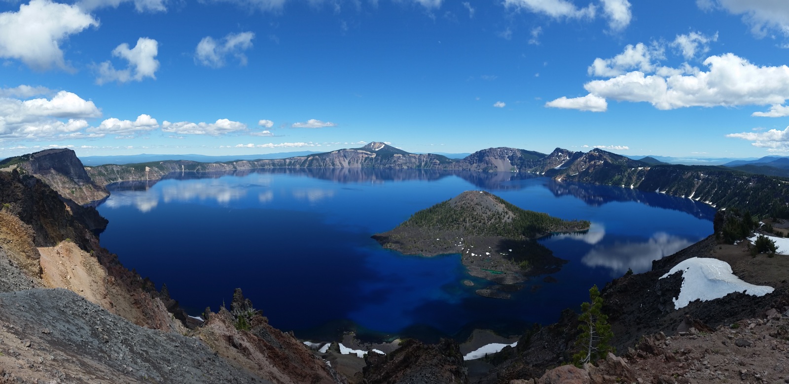Crater Lake really is as blue as pictures suggest. The snow on the surrounding peaks and the clouds added to the drama and beauty.