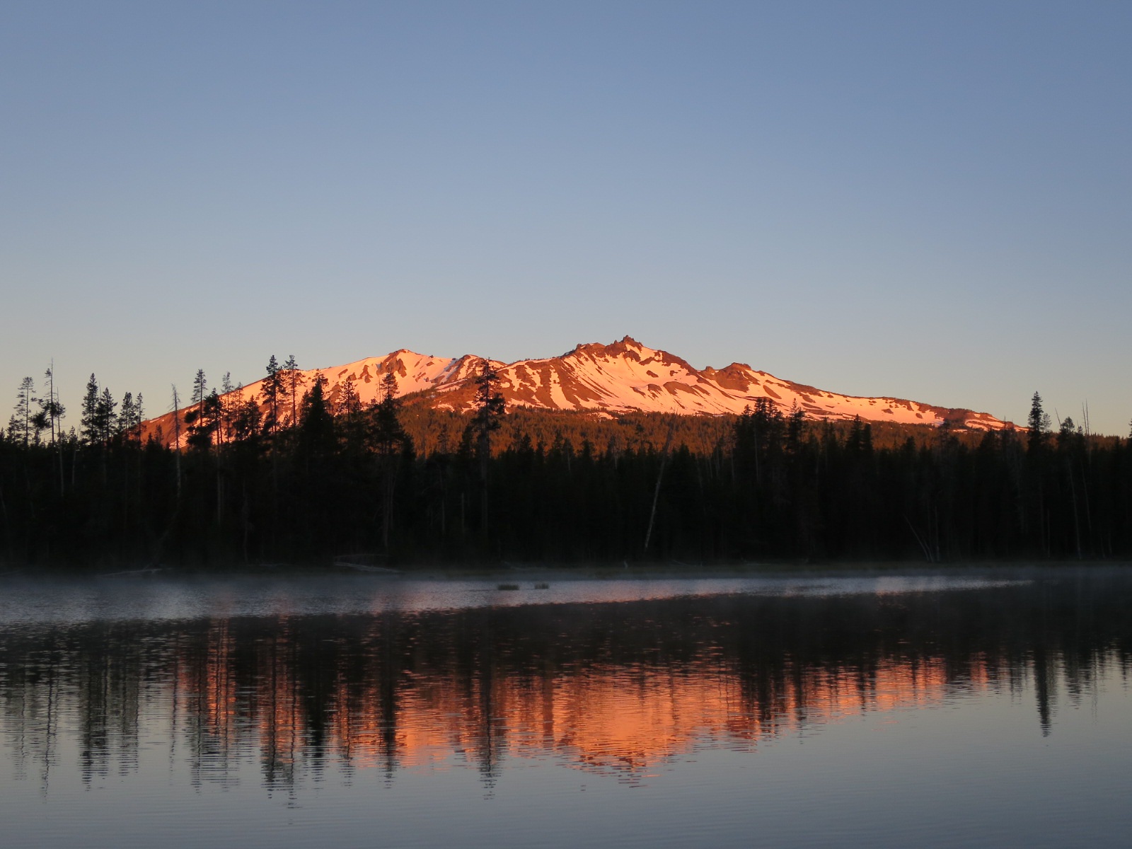 It was cold but there weren’t any mosquitoes. We took our stove and Talenti containers down to the shore and sat on a log watching steam rise from the lake. Diamond Peak basked in the early morning light and the reflection on the lake was similarly beautiful.
