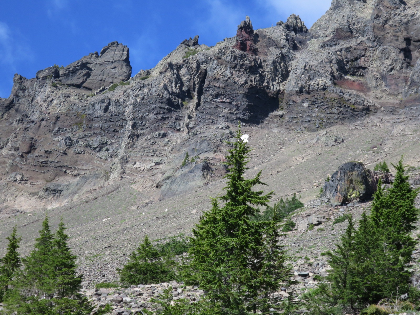 About a mile later the trail opened up and we walked along the scree at the base of Three Fingered Jack. Laurie spotted at least 5 mountain goats traversing the mountain.