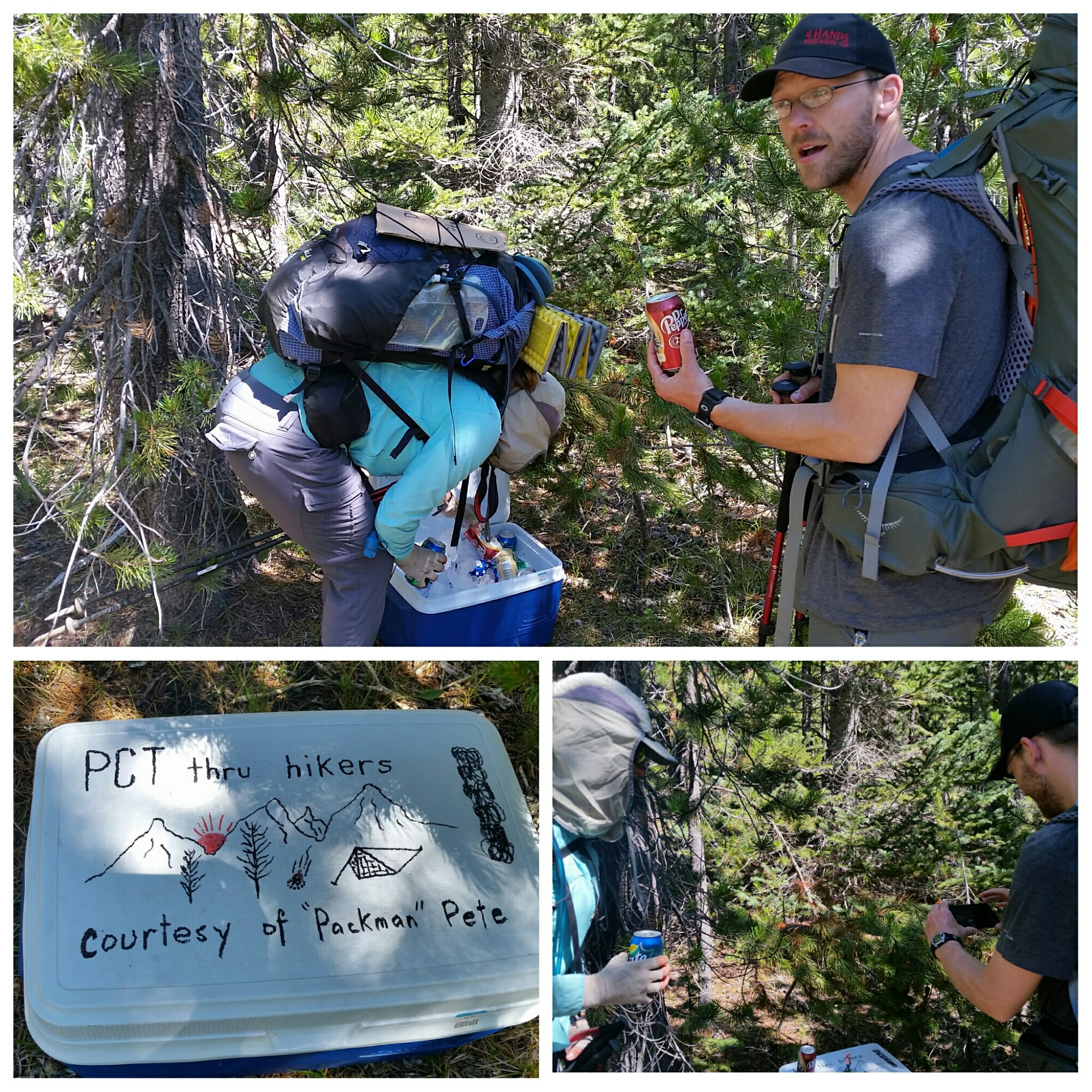 We re-joined the PCT 1.5 miles later and within 5 minutes stumbled along trail magic! Ten feet from the trail was a nicely decorated cooler with soda and beer. We had just eaten a big breakfast full of sugar but Laurie couldn’t resist trail magic.