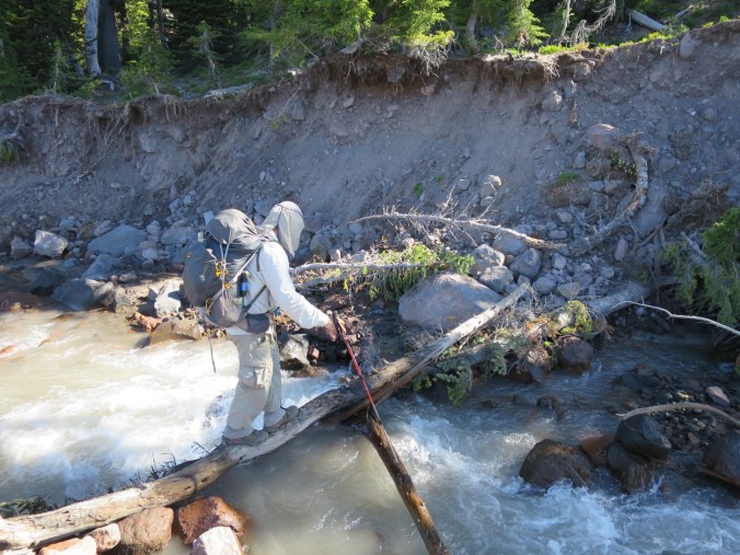 The water was murky and fording it would be tricky since we couldn’t see were to place our feet. We looked and found logs on which to cross.