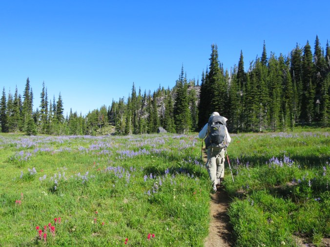 The grass and flowers were covered by a layer of dew. We walked slowly through the meadows, admiring the fields of lupine. It was very hard to keep a steady pace today. Both of us were in awe of the beauty and kept stopping to stare.