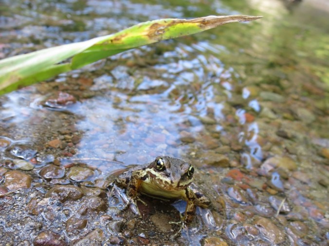 We crossed a beautiful creek around 4:30. As Andy stepped across 2 frogs jumped out of his path. We admired and watched the frogs for 15 minutes. We got water for 10 miles (5 today and 5 tomorrow) and a dry camp. Laurie soaked her feet and rinsed her socks before leaving.