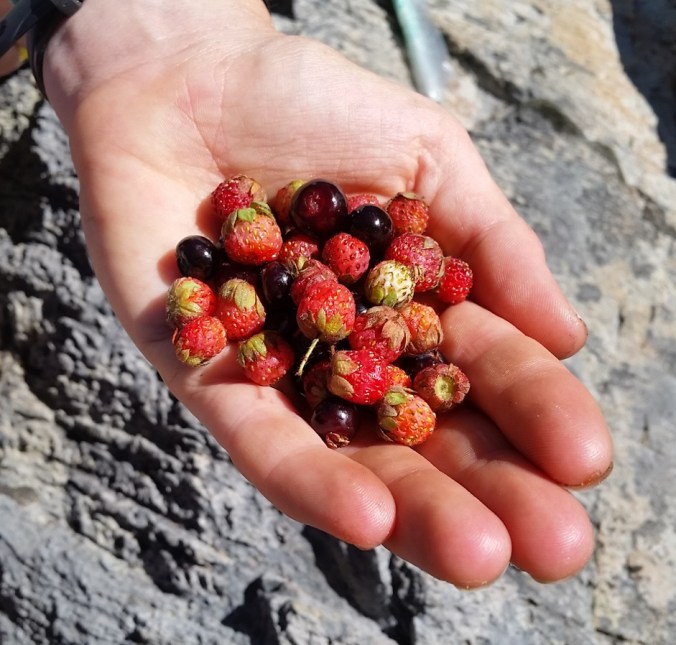 We walked on through the woods, subtly climbing and descending. We discovered wild strawberries alongside the trail. They were tiny but oh so sweet!