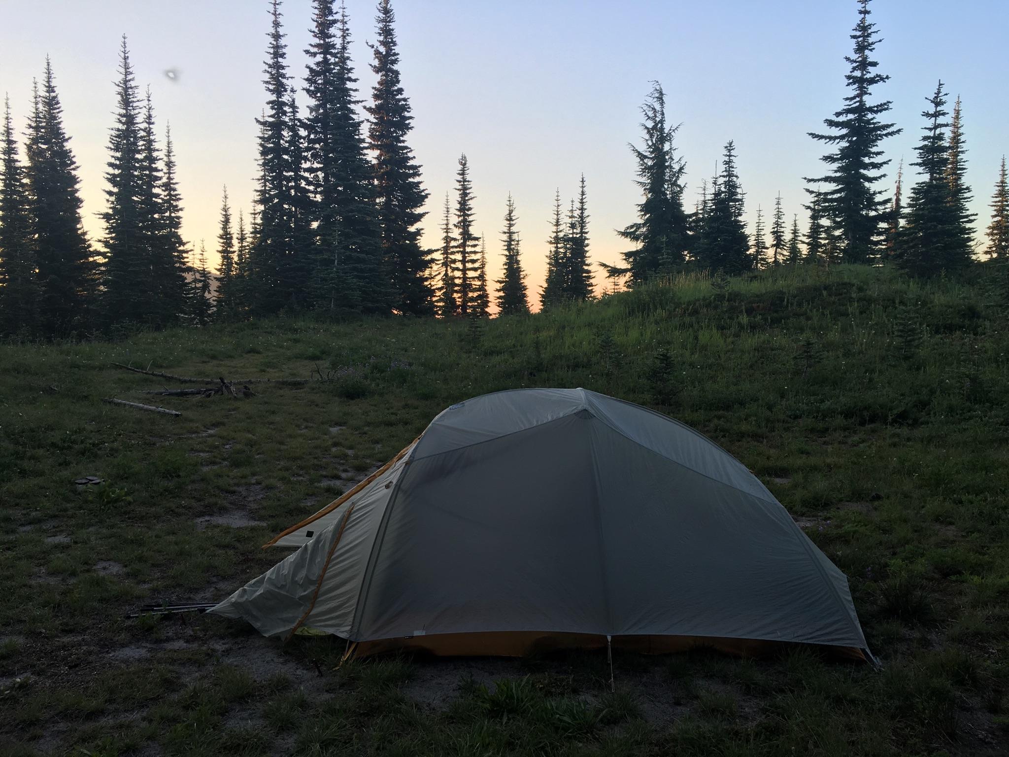 In 0.8 miles we found a flat spot on the top of the hill. Again it was grassy and will be wet in the morning but it is nice to watch the evening light reflect off the trees.