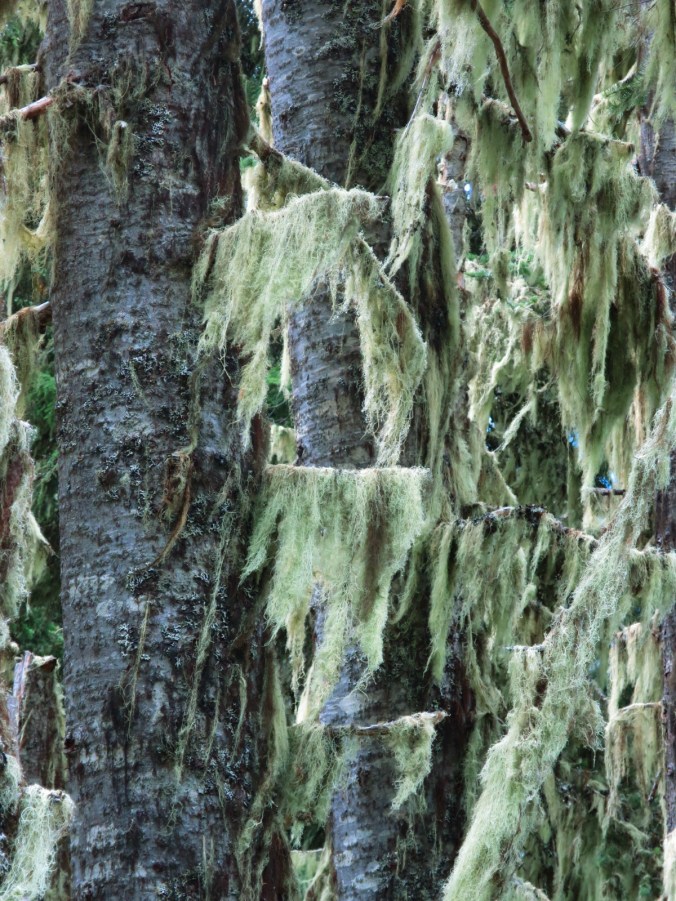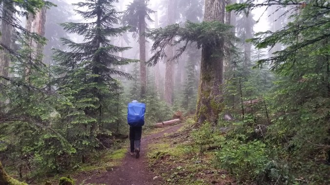 It wasn’t raining but we experienced periods of active fogging. And our feet got soaked in the first hour from the wet brush alongside the trail.