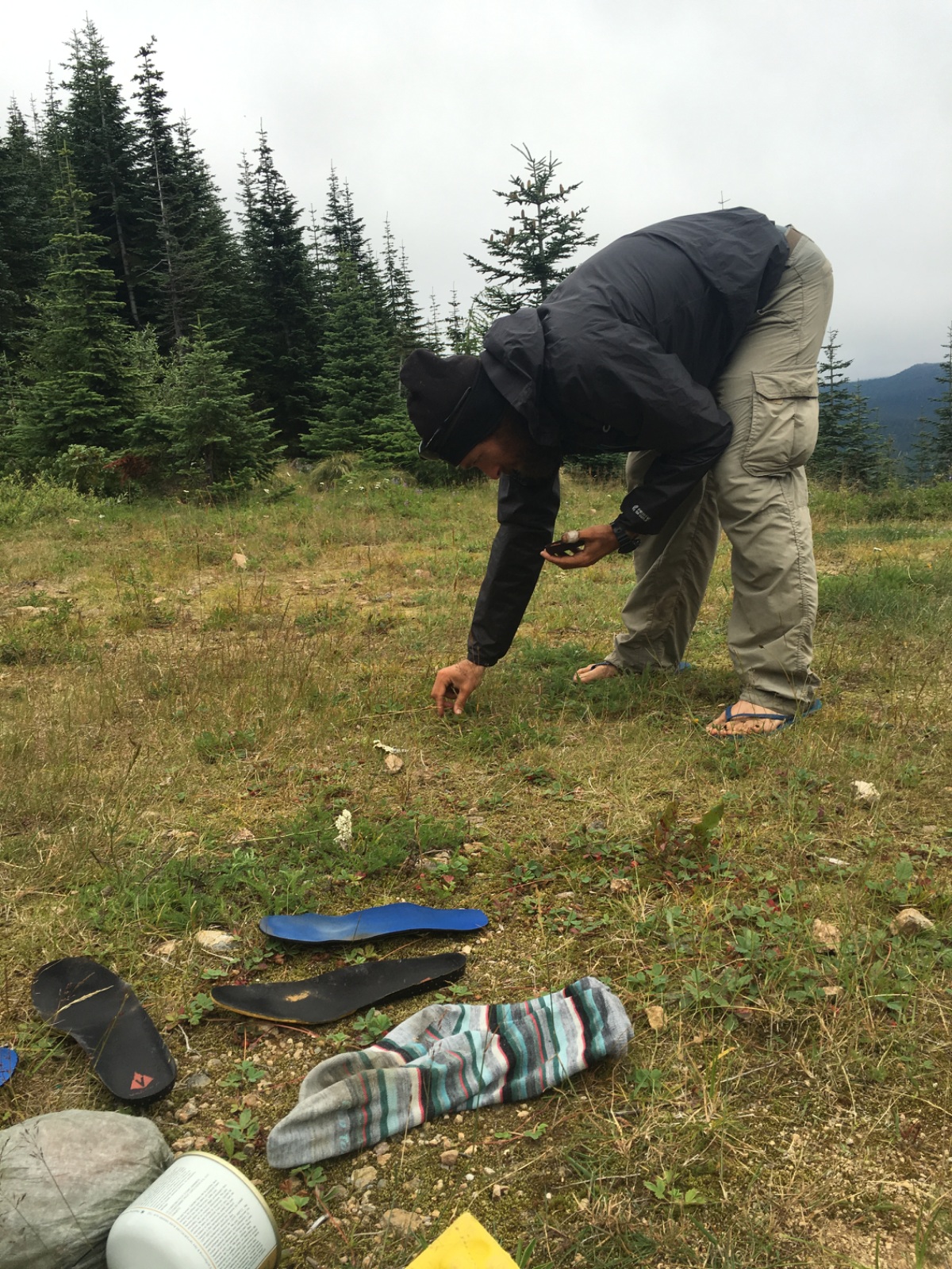 We woke up in a cloud yet again. The meadow near the hut was covered by low hanging fog. Everyone except the two ladies from France were gone by the time we packed up walked 100 feet to the cabin.