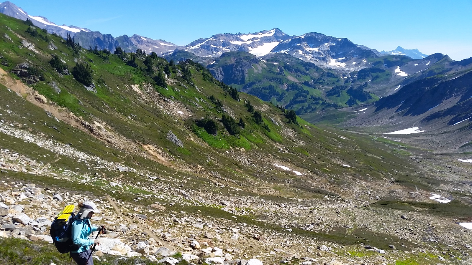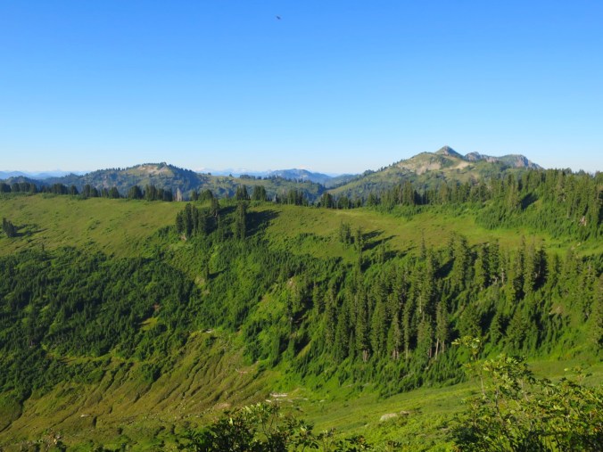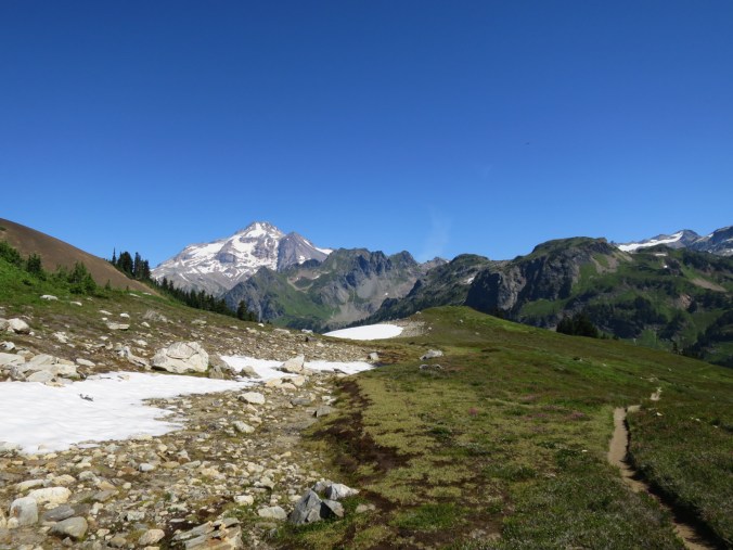 Around 6 o’clock we reached the top of the climb. We took a short break and enjoyed our daily chunk of cheese with fantastic views of Glacier Peak.