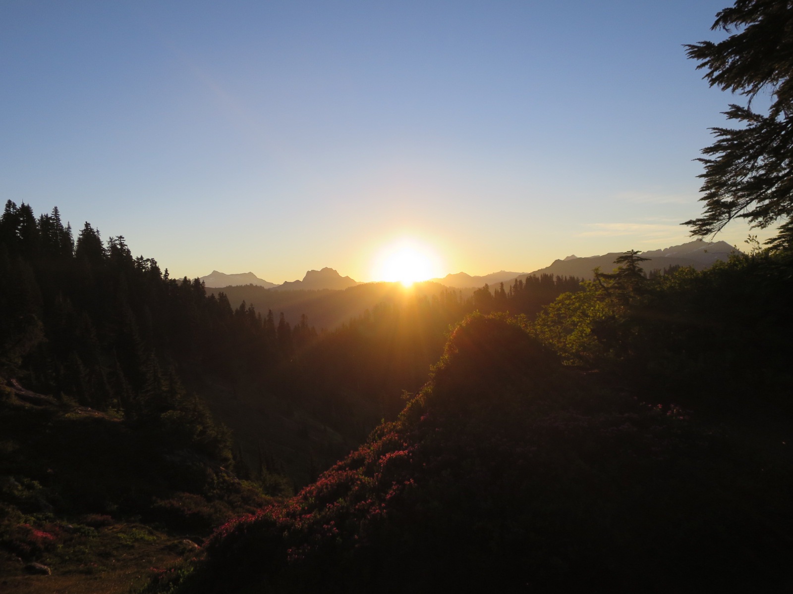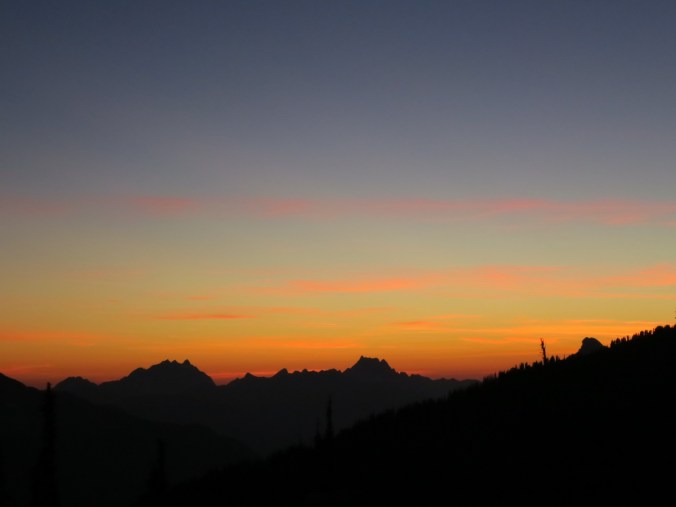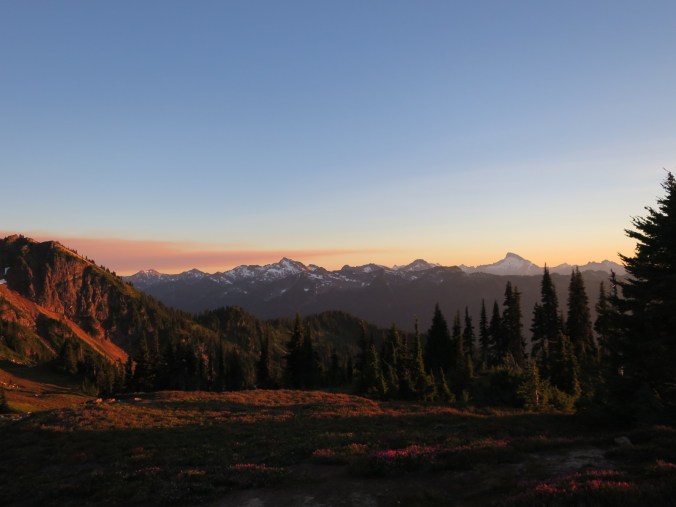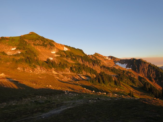 For Andy, this evening had moments of pain and lack of enjoyment. But once we got to a saddle his pain dissipated as he was distracted by views. Glacier Peak shone in the evening light.