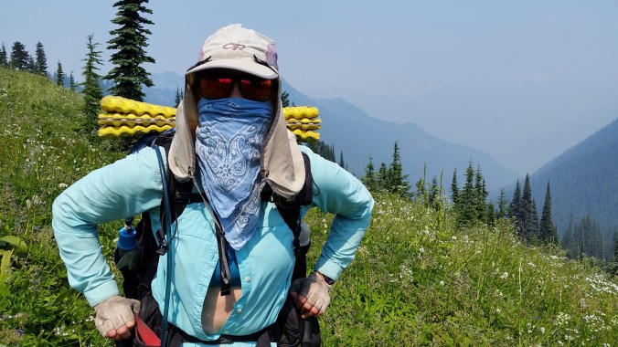 Laurie’s nose was burning and her lungs were feeling irritated from the smoke, so she tied her banana over her face, resembling the hiking bandit.