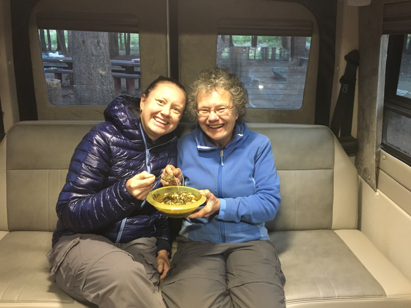 After the sun set behind the jagged peaks it got cold. We all piled into Sue’s van, drank hot water and ate dinner. The packaged saag paneer with chicken was good but we were both looking forward to the salad.