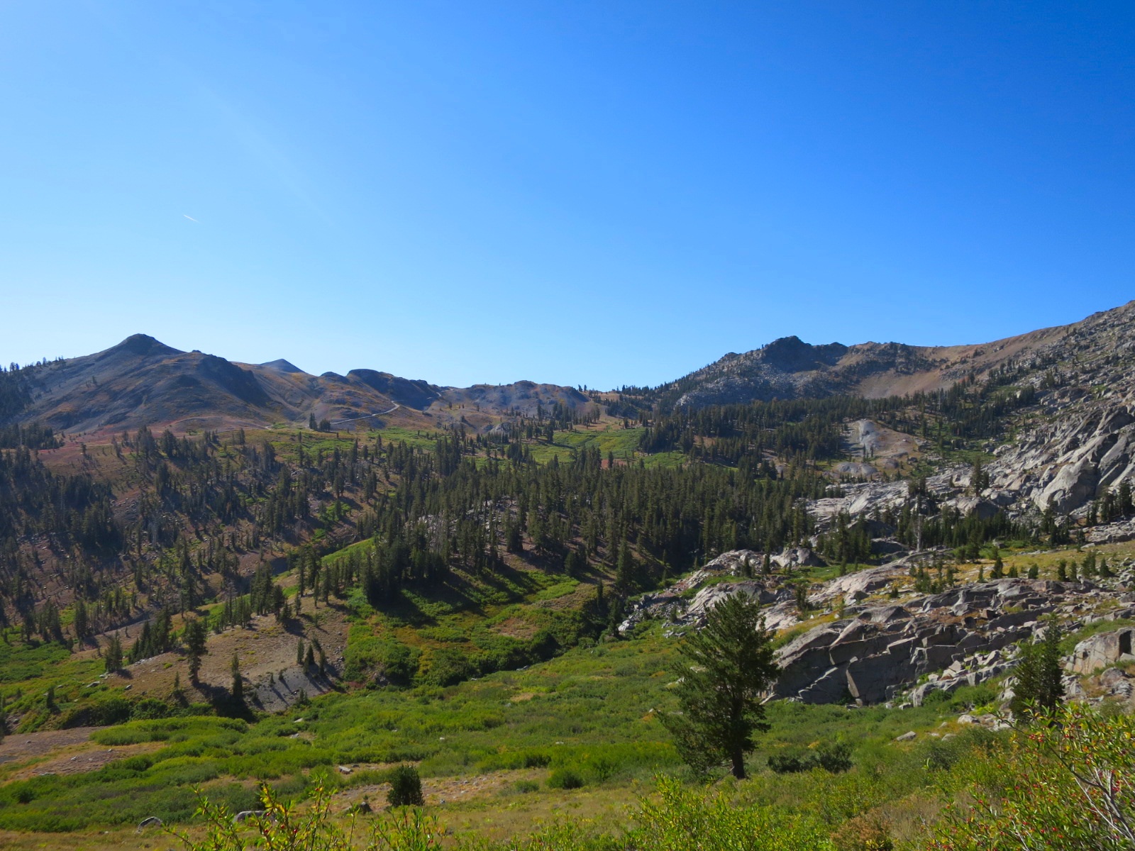 The air was warm as we hiked up a ridge above Upper and Lower Blue Lakes. Smells of bacon and pancakes wafted into the air from the campground below.