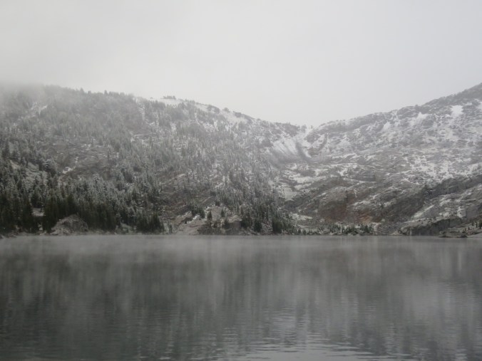 We had all planned to wake up early to catch the sunrise over Dicks Lake, but when we woke up around 6:30, it was to the sound of snow.