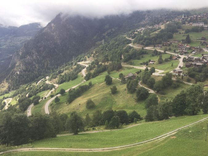 We rode for another 10 minutes through valleys with vineyards oriented in different directions, offering great texture to the hilsides. We correctly disembarked in Sion and transfered to another train that would take us to Martigny. From there we took another train to Le Chable, followed by the gondola to Verbier.