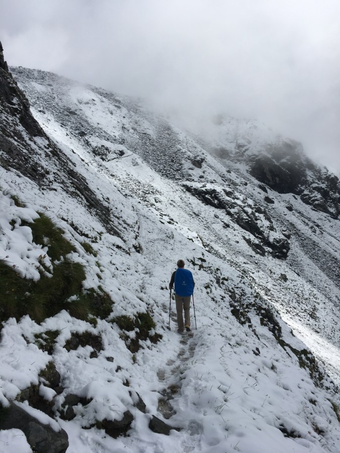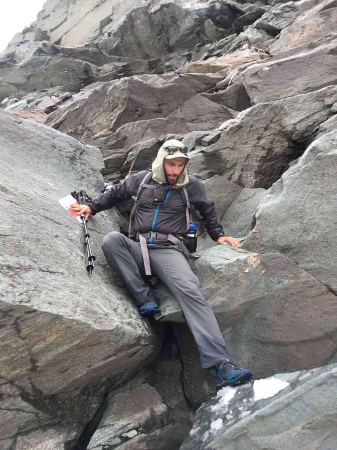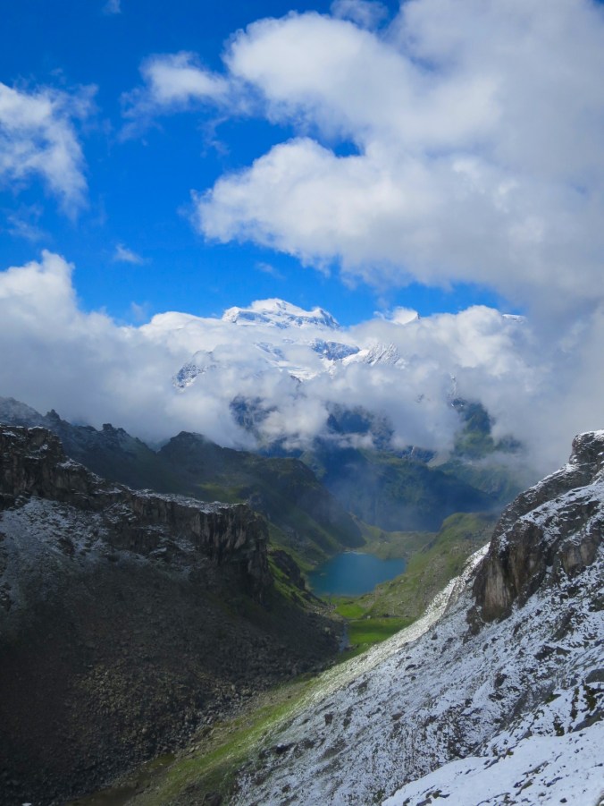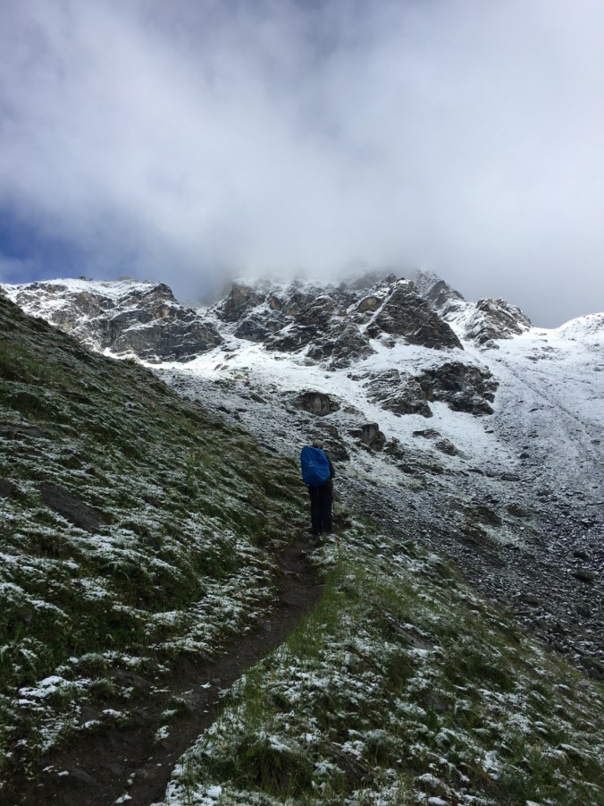 Luckily it wasn’t coldEdit, therefore didn’t take long for us to take off our jackets and shortly after our rain pants. The clouds continued to float in and out as we climbed back up to the trail we had left the afternoon before to drop down to Cabane de Louvie.
