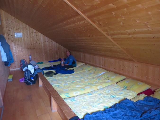 In the end it didn’t matter as there was room in the hut. We got settled in our dorm room (9 mats lined directly next to one another), used wet wipes to clean up (after hiking the PCT we don’t feel like we need a shower, especially one we have to pay 5 Swiss Francs for).