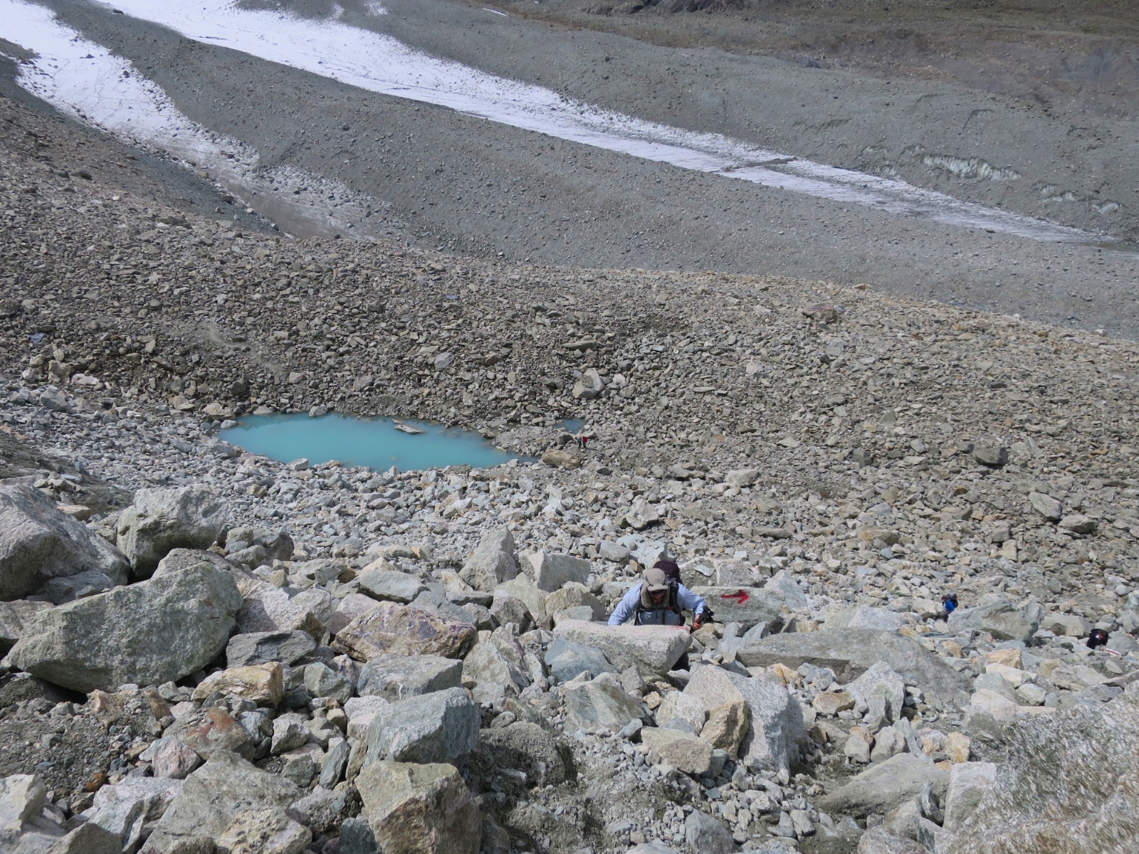 The trail came to a few more junctions before climbing steeply towards the Col. Here again, there was no trail but a boulder field with red and white painted blazes marking the route. Luckily there was no snow to contend with so the going was easier and faster.