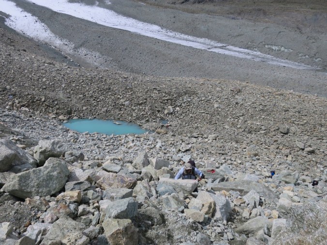 We picked our way across fields of shale, medium sized boulders and trail. We walked to the base of the Chelion glacier and took a lengthy break in hopes that Mont Blanc de Chelion would fully emerge from the clouds. It didn’t. So after 20 minutes we set off again.