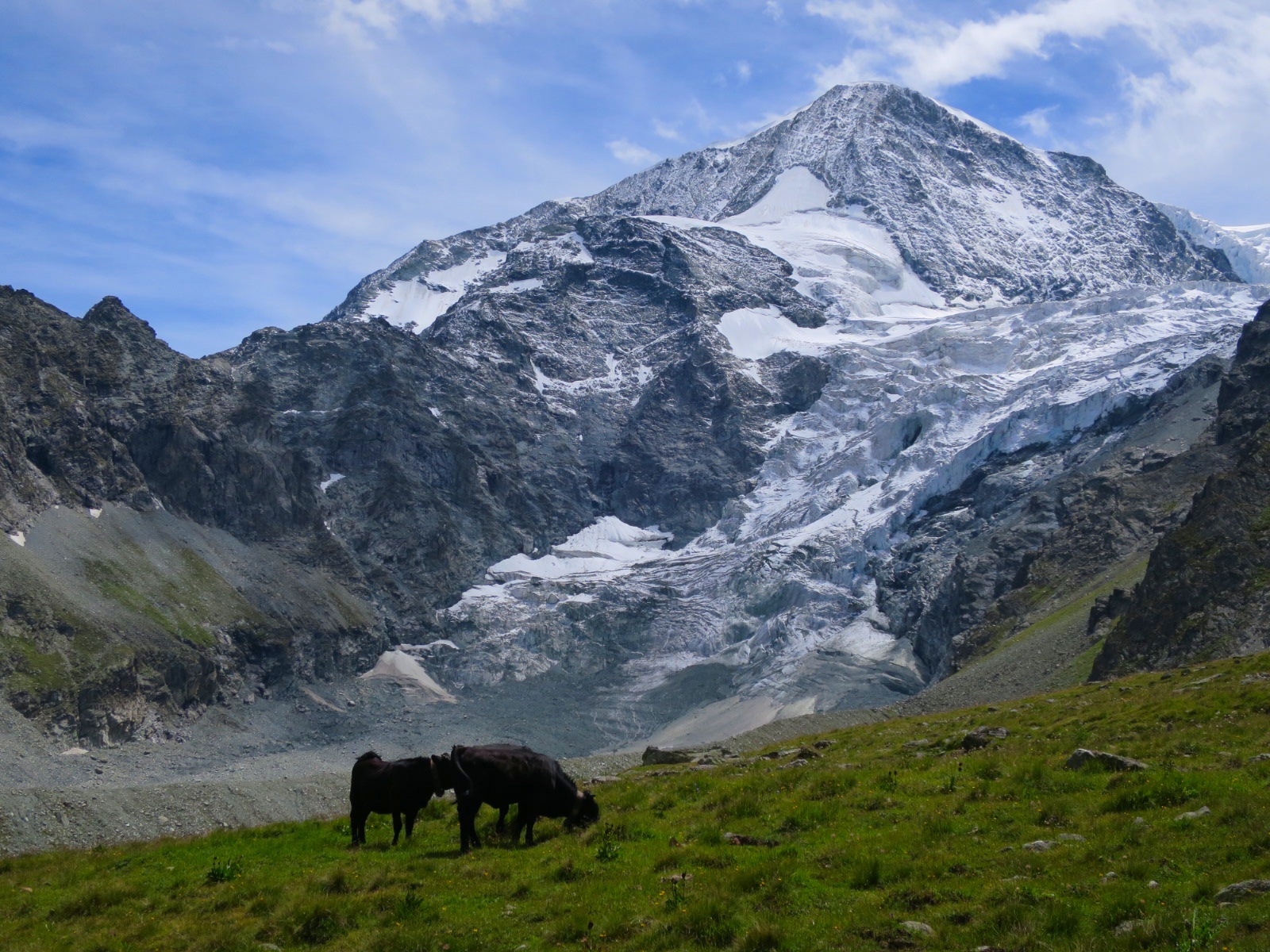 From here we began our climb toward Col de Riedmatten. It started out steeply as many small, deep and narrow paths wound their way up the green hillside. We made our way slowly and steadily up toward the glacial moraine of Chelion glacier. We stopped a few times to make sure we were on the correct track since there were trails below us and nobody in sight.