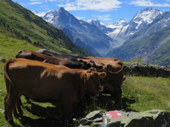 We carefully made our way down the slick rocks, taking a high traversing trail around the Lac de Moiry. Near the dam the trail widened to a disused road and we were met by a bunch of cows.