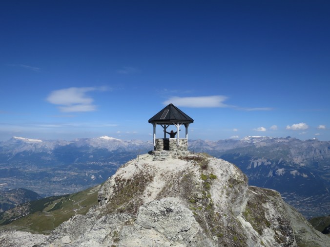 As we took in the 360 view from Bella Tola Laurie noticed a gazebo looking thing across the ridge. The trail we had planned on taking down looked rocky and sketchy so we decided to backtrack.
