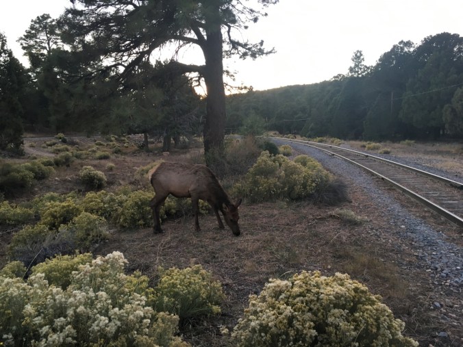 We were tired and ready to take off our shoes. But first we had to walk back to our car about a half mile from the Bright Angel Trailhead. Enroute to our rental car we saw an elk.