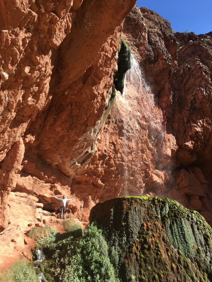 The sketchy bridge crossing was certainly worth it because Ribbon Falls was stunning! Given the time of year, it had decent flow and the drops of water cascaded down to a green mossy mound. The green in contrast to the red rocks was quite spectacular. Andy got very excited and ran up the trail that traversed behind the falls.