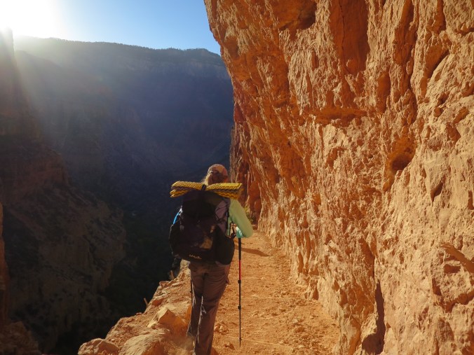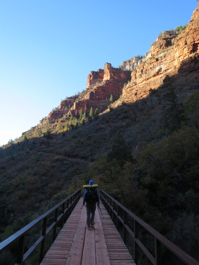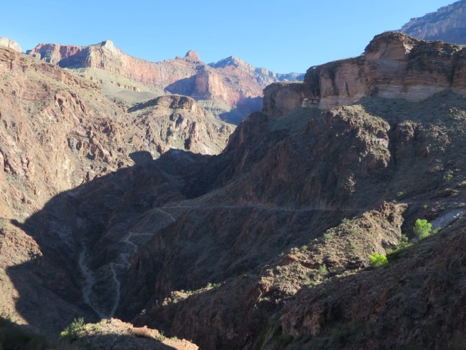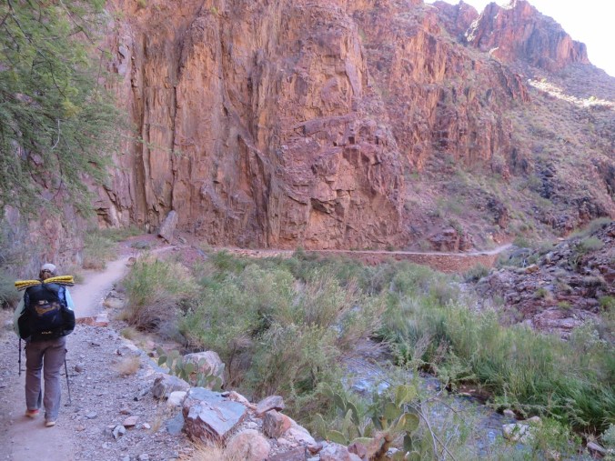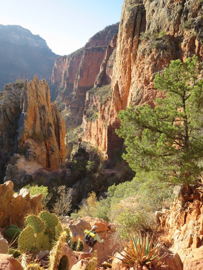 The weather was cool and we made great time hiking down into the canyon. Unlike the South Kaibab Trail, the North Kaibab trail has many undulations and crosses the canyon a few times. We both found it more interesting to hike on this trail, but it certainly wasn’t as dramatic and open as the South Kaibab Trail.