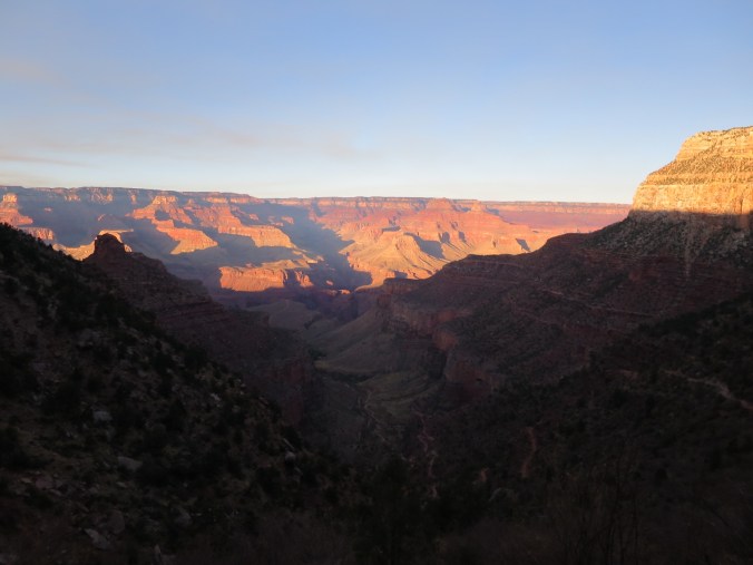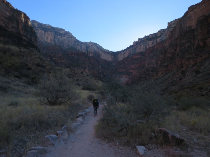 Thankfully the forest was still green and the campfires were out in the morning. We hiked out of the hiker/biker campsite at 5:45am, taking our time to avoid descending into the canyon in complete darkness.