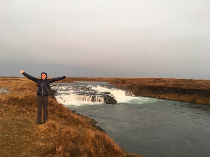 The first waterfall (Hjálparfoss) was great – 2 wide rivers conjoined via separate waterfalls into a nice round pond. As we got out of the car a tour bus showed up. We know we are in the right spot when there are tour buses!