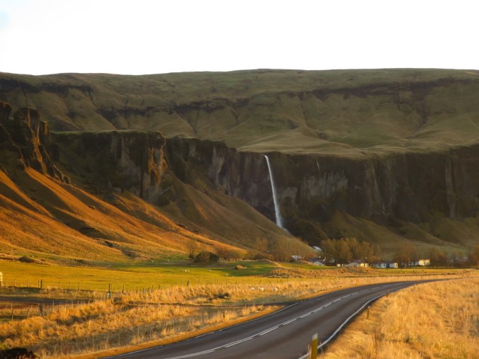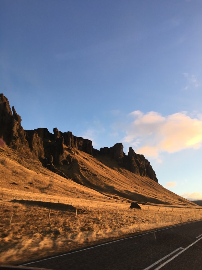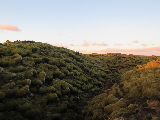 We drove through open pastures with grazing sheep and horses. The sun began to rise over the horizon occasionally obstructed by clouds. Volcanic rocks covered in moss scattered our surroundings as far as the eye could see.