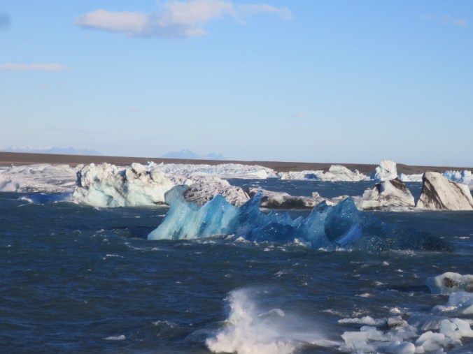 White caps hurried across the lake surface and icebergs bobbed up and down in the waves. Rainbows formed in the mist from water crashing over the icebergs.