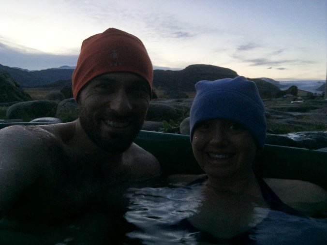 The Hoffell hot spring was 1 km down the road. When we pulled up there were 2 large RVs and a few other cars already there. The wind was still ripping and the walk from the changing room to the hot tub was painfully cold.