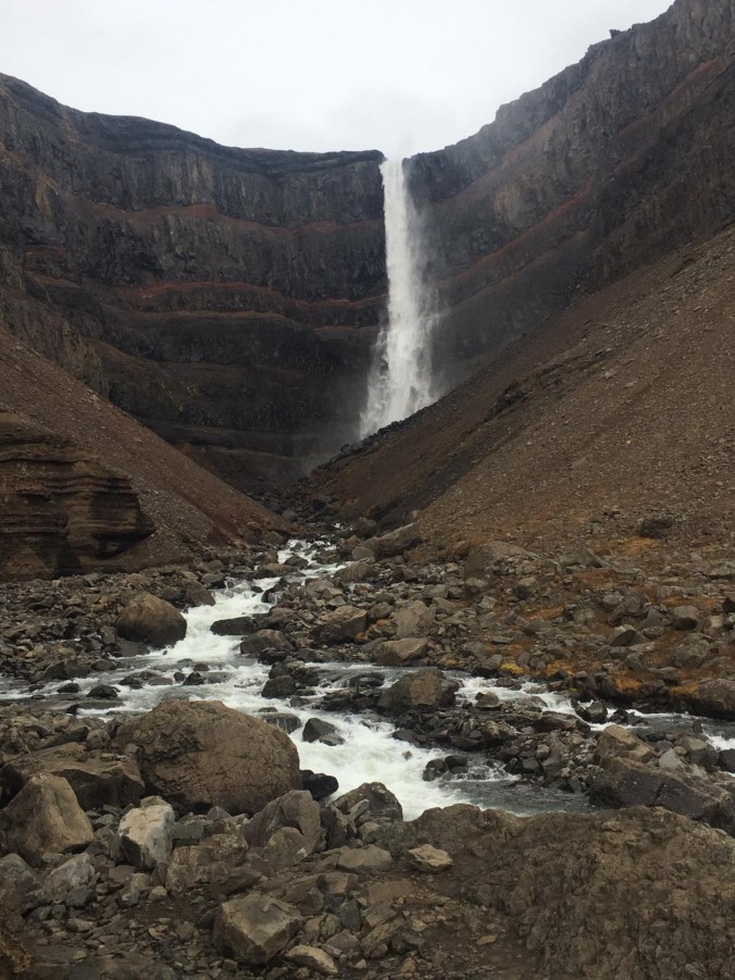 We drove next a long narrow lake which was the home to Iceland’s largest forest. At the end of the lake we took a 40 minute hike up a hill to see Iceland’s 3rd tallest waterfall – Hengifoss. This 128 meter high waterfall is unique because of the red layers of clay between the basalt.