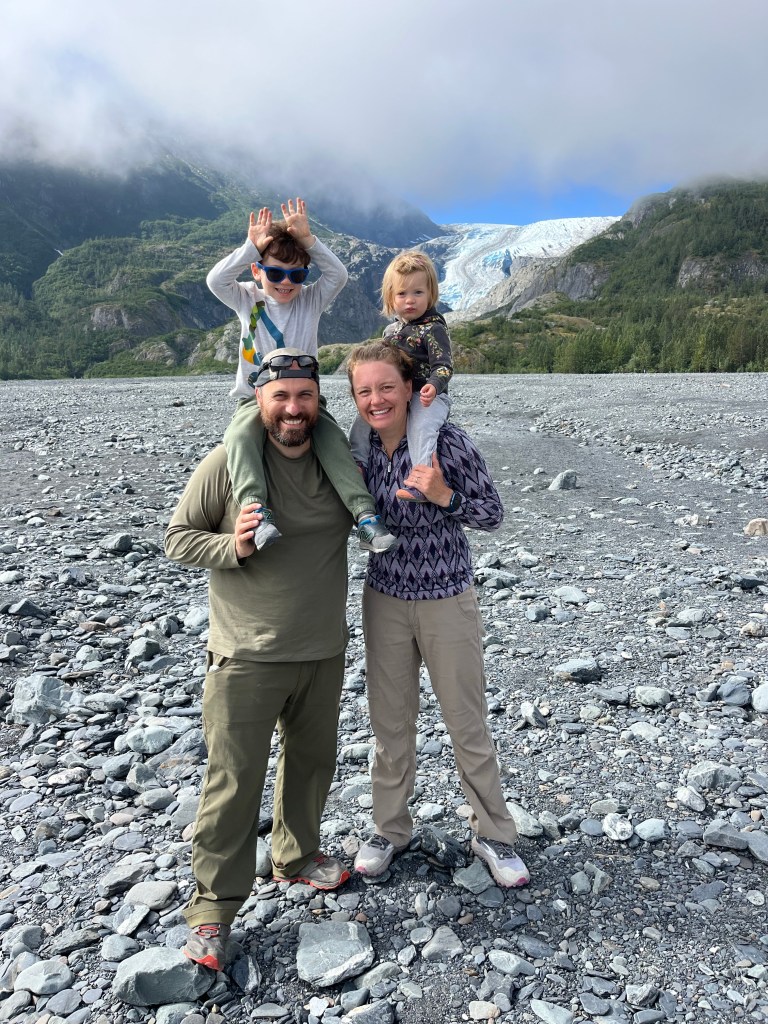 Wednesday started off cloudy and gloomy but by early afternoon the sun was out. We spent most of the day at Exit Glacier. We walked about 0.5 miles to the glacier moraine and the kids had a great time playing with the rocks, sand and water. It was nice watching Ani navigate the uneven terrain with her still new-ish walking legs and Miles got very creative building roads through the sand. Arya and Jeanie played with us for a bit before returning to the trailhead to meet Nancy. Laurie walked around a bit more to give Ani a chance to sleep while Andy and Miles ran around the parking lot checking out adventure rigs.