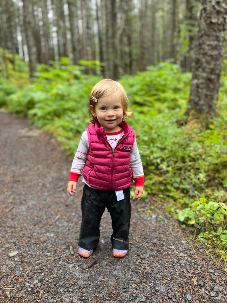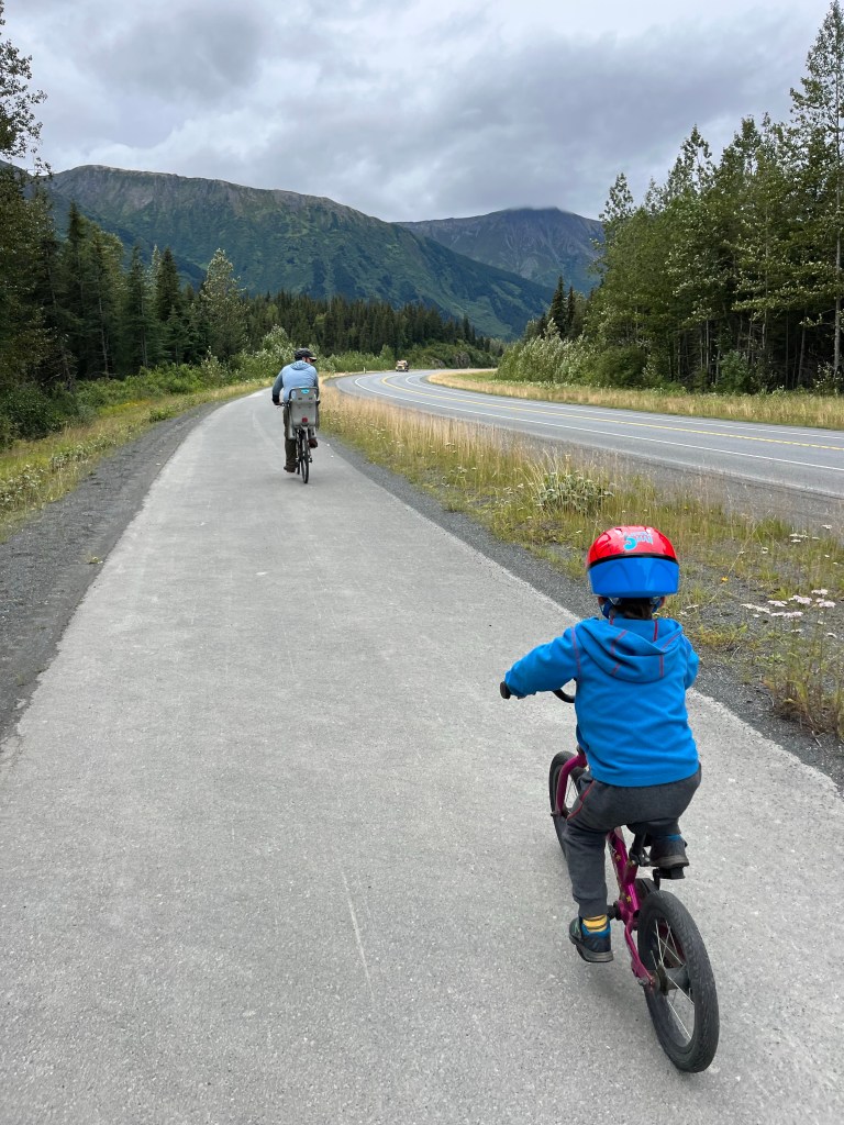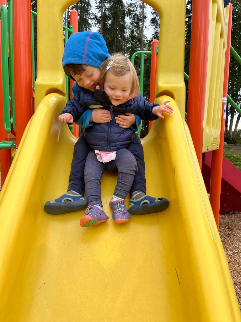That afternoon we tried to take advantage of a break in the rain to let the kids run. Anchorage has amazing and plentiful parks and playgrounds. As we opened the RV door at the playgriund we discovered we were missing one of Miles’ shoes. It had likely fallen out when we climbed in after our bike ride. Oops!! After an hour plus of giggles and playing on the slides, Andy and Miles drove back in search of the shoe while Laurie walked around to give Ani a late afternoon nap.