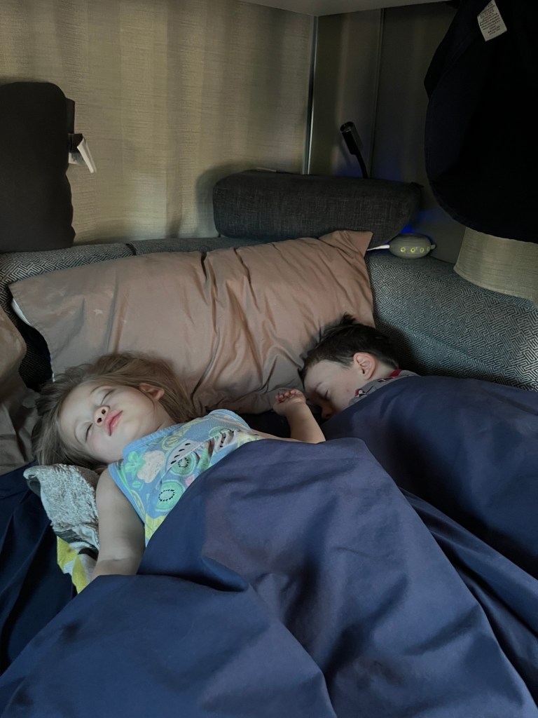 After lights out Andy transferred Ani to Laurie in the lower bed. Thankfully Ani stayed asleep. Miles stayed relatively calm and fell asleep around 1030pm after a lot of coughing 😦