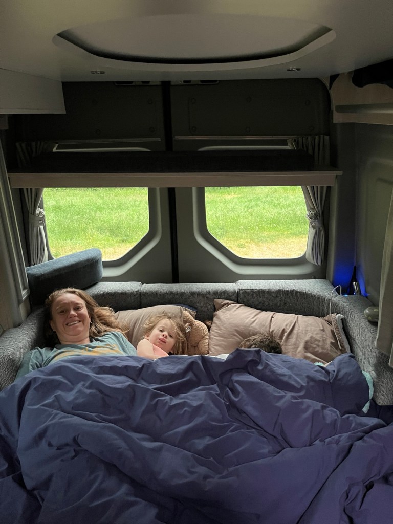 Predictably, Miles protested because he was having so much fun. Eventually we convinced him it was time to go after making the largest mud calzone anyone has ever seen. We cleaned feet, put on shoes and walked back to blue wave – if we haven’t mentioned it before, that’s what the kids are calling the camper van.