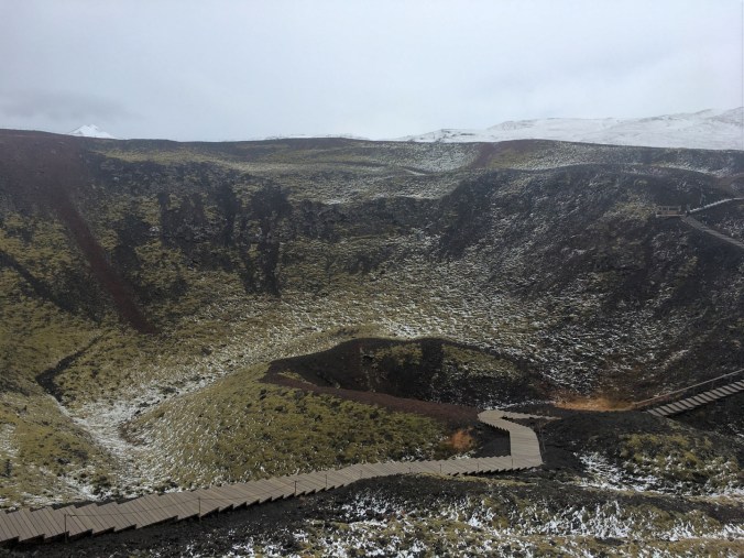 We laughed at ourselves for being so cheap, payed our entrance fees and walked around the top of the crater. It was pretty with the blue/green water in contrast to the red volcanic rock and vibrant green moss. Of course nothing was as vibrant as it could have been with heavy cloud cover and mist but it wasn’t raining.