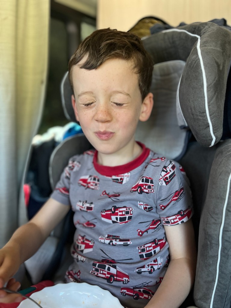 Miles ate some tortellini, and eventually so did Ani. Andy needed a shower and decided to take one. We also decided that since we had accidentally bought bone-in chicken thighs and now had raw chicken in a paper bag along with our other trash, we would drive the 10 minutes back to town, dump the grey water again, top off the fresh water, throw away our trash and then head to camp.