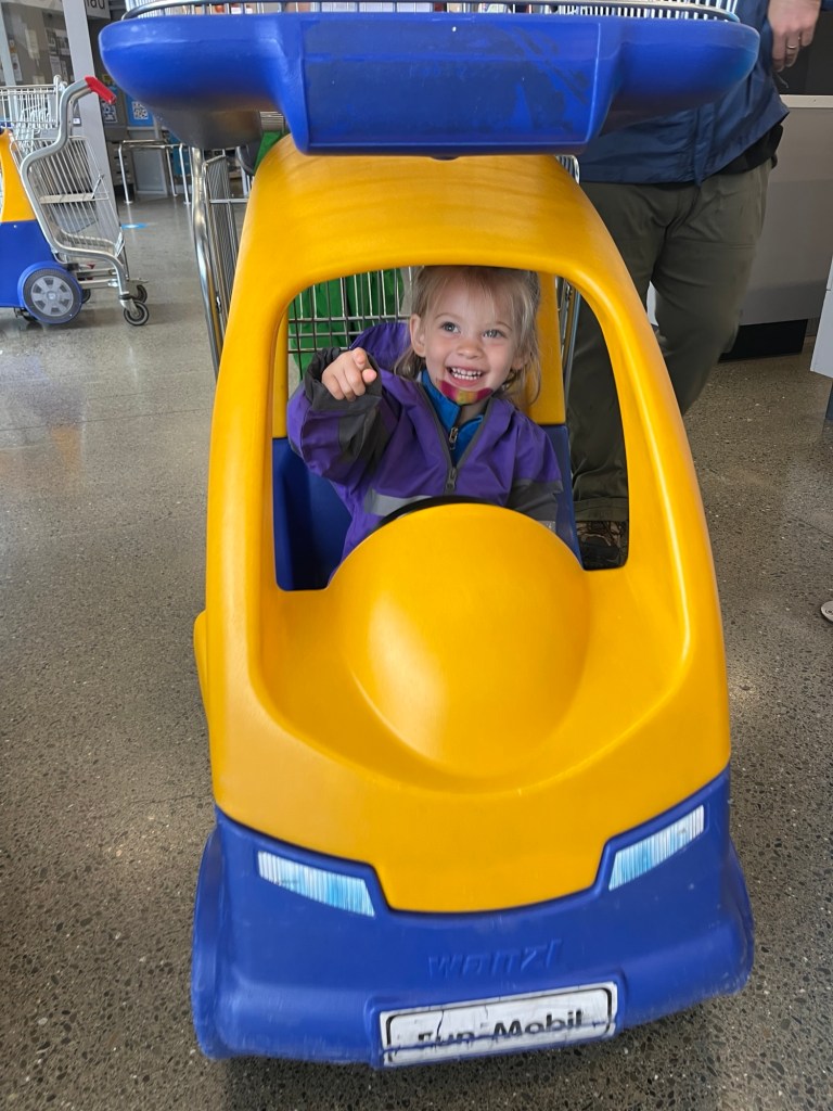 Walking into the grocery store We found a car cart!! But it was only a single seater (miles tried it as well but didn’t fit :/)Copilot MilesNap time for allIt is hard work being a co pilot